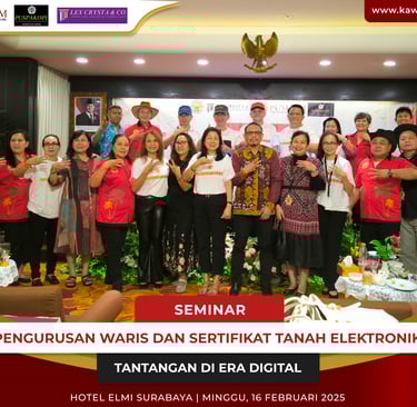 [www.kawanuasurabaya.id] – Kerukunan Keluarga Kawanua Surabaya (K3S) sukses menggelar seminar bertajuk “Pengurusan Waris dan Sertifikat Tanah Elektronik: Tantangan di Era Digital” yang dihadiri oleh lebih dari 100 Peserta di Hotel ELMI Surabaya 16 Februari 2025. Seminar ini menghadirkan para ahli di bidang Pertanahan, Hukum, dan Notariat untuk memberikan wawasan terkait perubahan dan tantangan dalam pengurusan waris serta sertifikasi tanah elektronik di era digital.