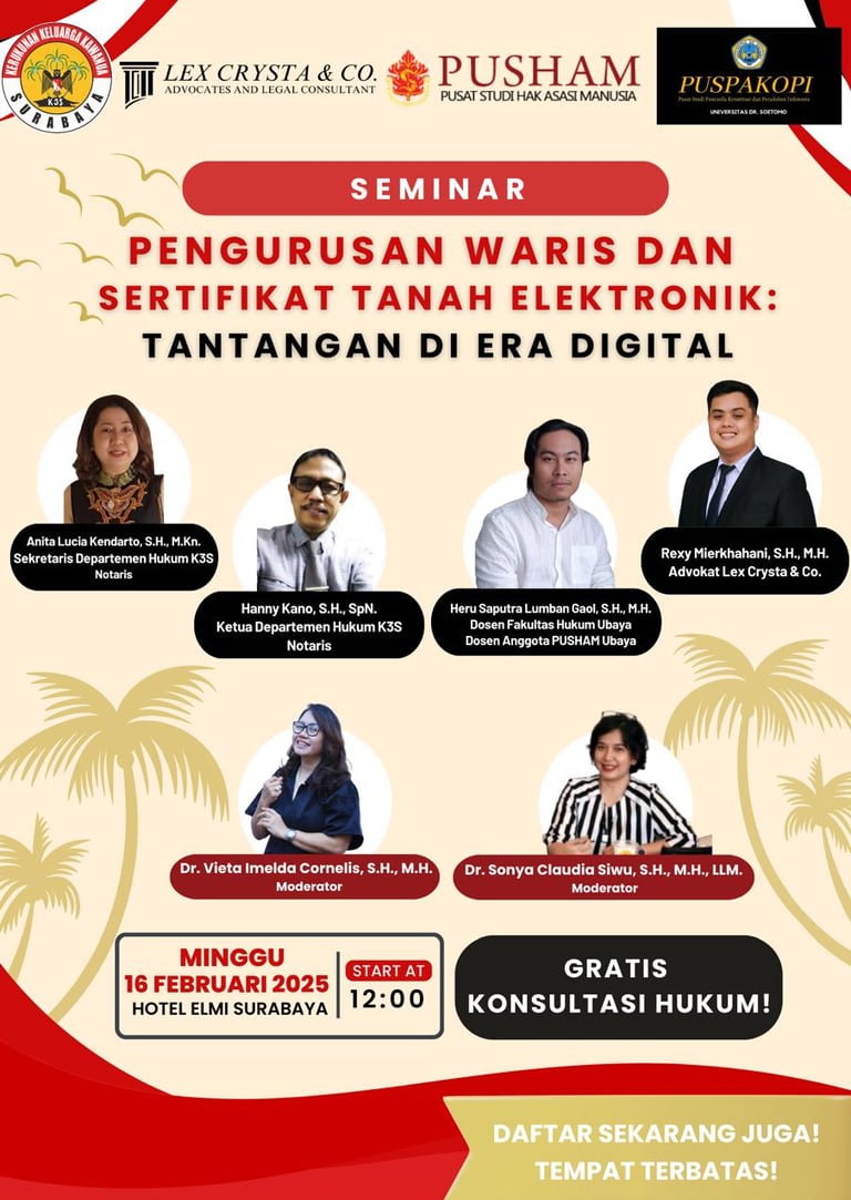 Seminar ini terselenggara berkat kerjasama antara K3S, Pusat Studi HAM (PUSHAM) Universitas Surabaya, dan Pusat Studi Pancasila Konstitusi dan Peradaban Indonesia Universitas Dr. Soetomo (PUSPAKOPI UNITOMO), serta Konsultan Hukum Lex Chrysta & Co. Dengan terselenggaranya seminar ini, K3S berharap masyarakat semakin memahami regulasi terbaru terkait waris dan sertifikat tanah elektronik serta mampu beradaptasi dengan perubahan di era digital. Acara ini menjadi langkah awal dalam meningkatkan literasi hukum dan kepemilikan aset tanah yang sah di kalangan masyarakat.